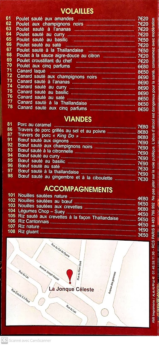 Don't miss out on their flavorful Accompaniments like the Nouilles sautées nature aux légumes and Riz Cantonnais au poulet, which perfectly complement their main dishes. The attention to detail and quality ingredients make each dish at La Jonque Céleste a true culinary delight.